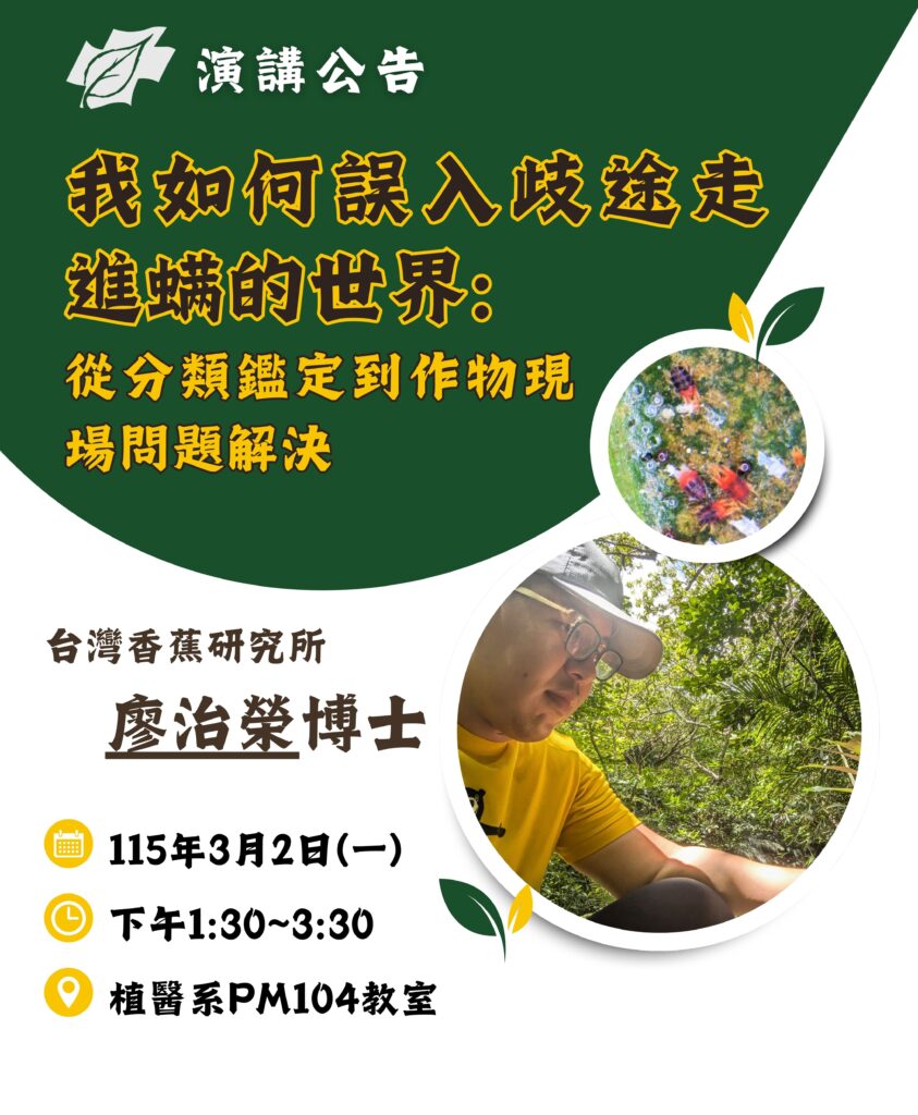 【植醫系專題演講】廖治榮博士-我如何誤入歧途走進螨的世界:從分類鑑定到作物現場問題解決
